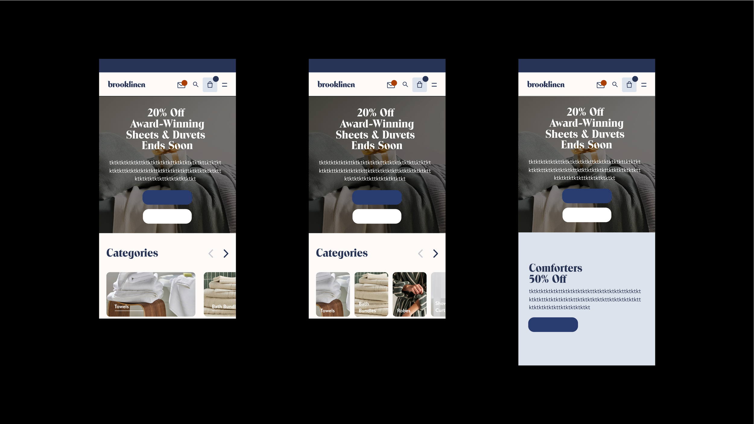 In addition to the exploration I completed 5 unmoderated user interviews to benchmark Brooklinen’s strengths and weaknesses against key competitors. This additionally validated our initial hypothesis of surfacing product categories above the fold as we saw this was a market trend.